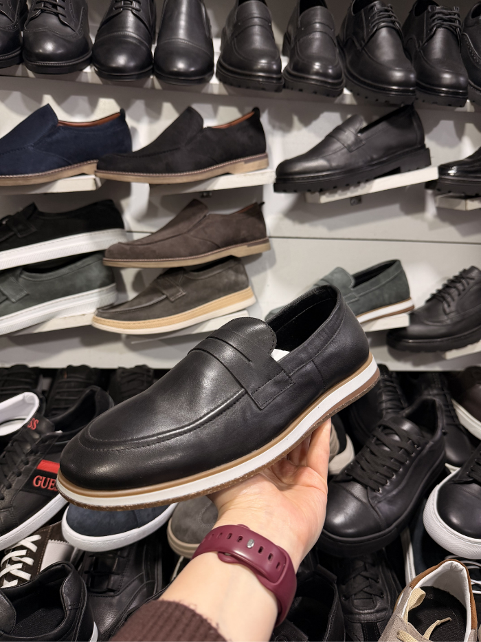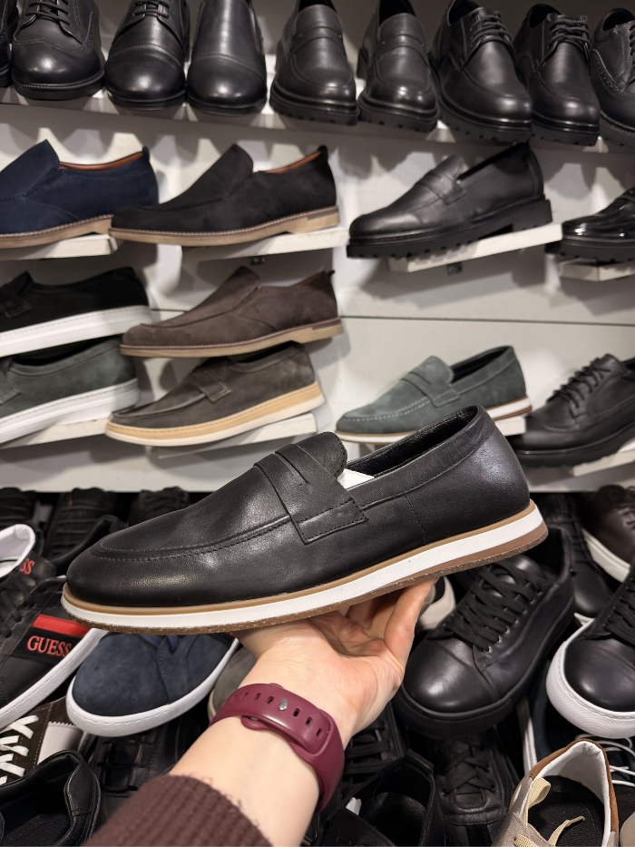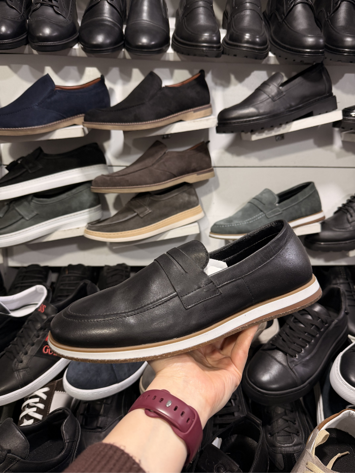 ტყავის მოკასინი ე.წ "თევზის ძირით", საქართველოში შეკერილი. გამორჩეული დიზაინი, რომელიც აერთიანებს ტრადიციულ სტილსა და პრაქტიკულობას. უნიკალური ელემენტები ქმნის გამორჩეულ და კომფორტულ ფეხსაცმელს ყოველდღიური ან ნახევრად ოფიციალური შემთხვევებისთვის.
