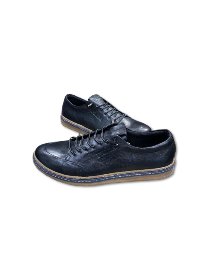 მამაკაცის შავი ტყავის ფეხსაცმელი ნაკერითა და ყავისფერი ძირით — კომფორტული და სტილური არჩევანი ყოველდღიური ჩასაცმელისთვის.