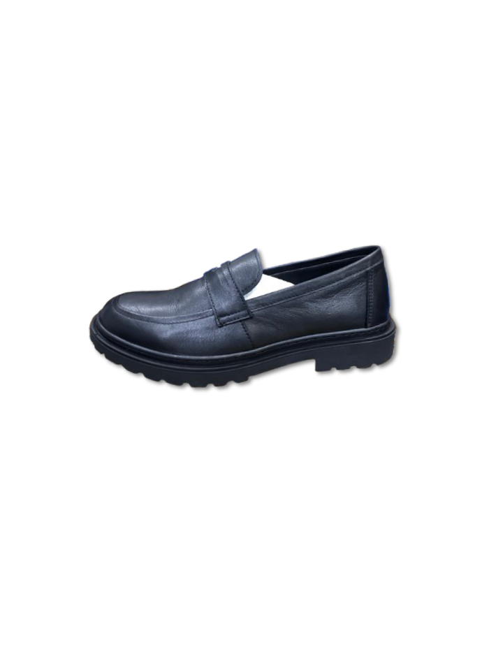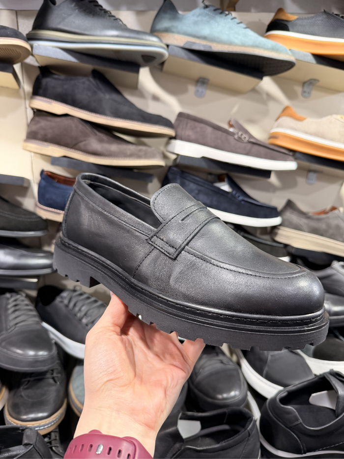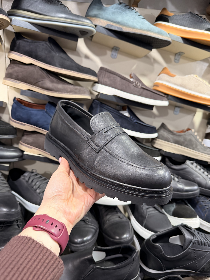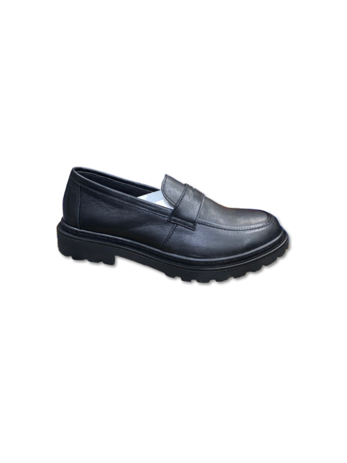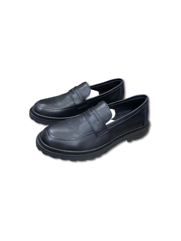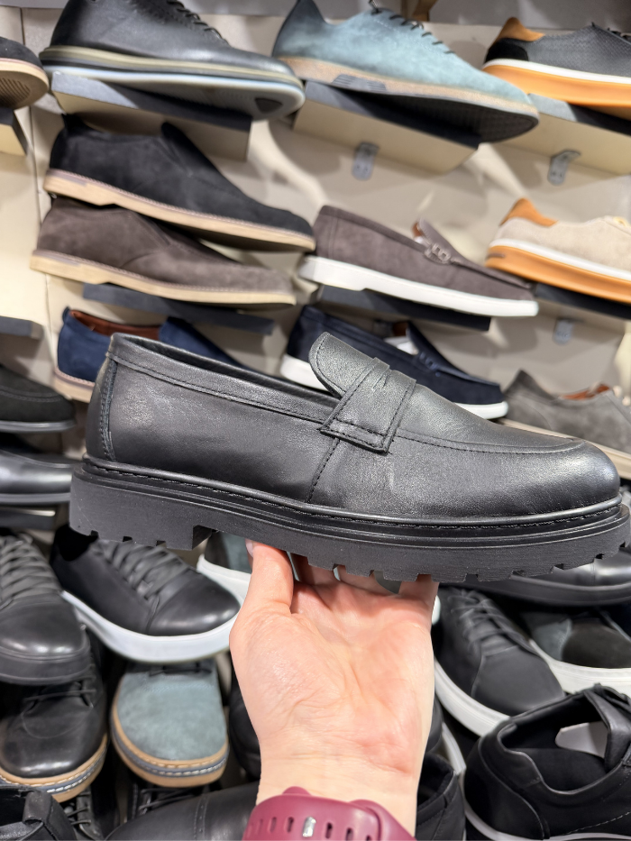 კლასიკური შავი ტყავის ლოფერი გამოკვეთილი ფორმით და მსუბუქი მასიური ძირით — იდეალურია როგორც ყოველდღიური, ისე ელეგანტური ლუქისთვის.