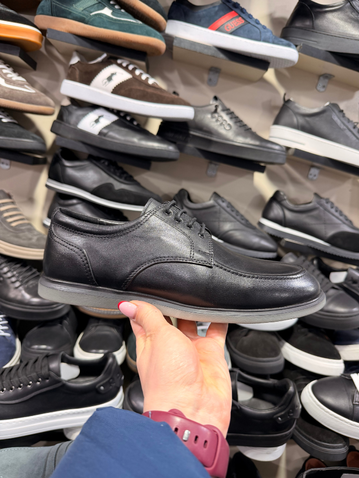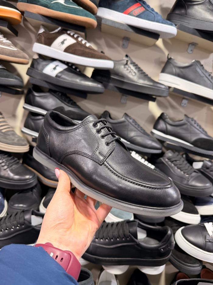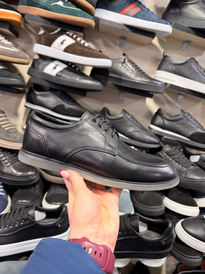 ელეგანტური შავი ტყავის ფეხსაცმელი, დახვეწილი ფორმით და მინიმალისტური დიზაინით. კომფორტული და მსუბუქი ძირი უზრუნველყოფს ყოველდღიურ მოხერხებულობას, ხოლო კლასიკური სტილი იდეალურად ერგება როგორც ოფიციალურ, ისე casual ჩაცმულობას.